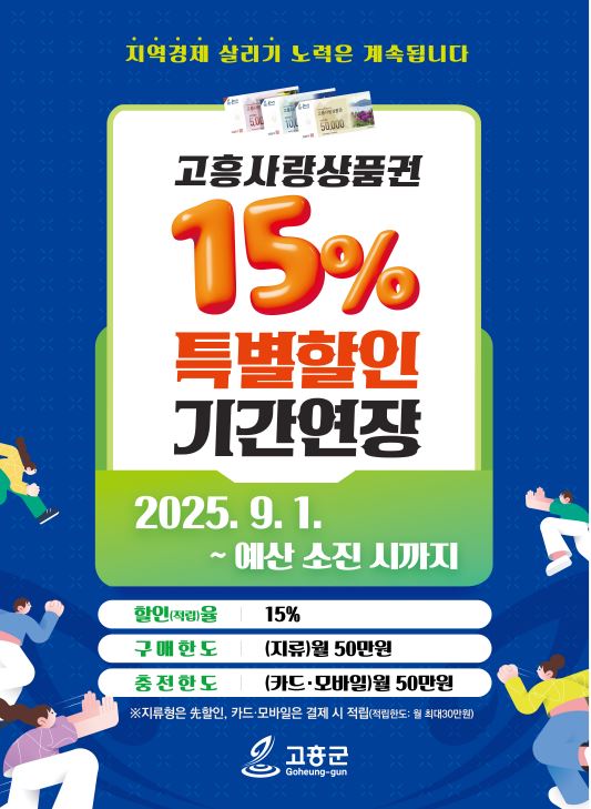 고흥군은 군민들의 생활 안정과 소비 촉진을 통한 지역경제 활성화를 위해 고흥사랑상품권 15% 특별할인을 다음달 1일부터 예산 소진 시까지 연장한다고 밝혔다.