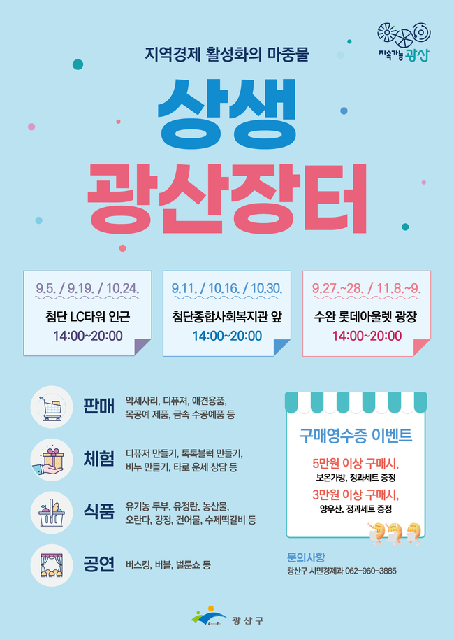 광산구 관계자는 “‘상생광산장터’는 지역 사회적 경제 기업과 소상공인, 시민이 함께 지역 경제와 사회를 함께 건강하게 하는 가치를 나누고, 확산하는 장”이라며 “지역 경제 활성화의 마중물이 되도록 많은 시민의 관심과 참여를 바란다”고 말했다.