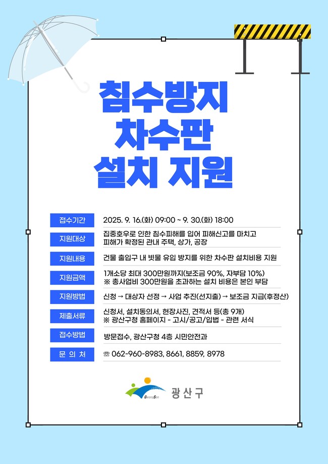 침수방지 차수판 설치 지원과 관련한 자세한 사항은 시민안전과(062-960-8983, 8661, 8859, 8978)로 문의하면 된다.