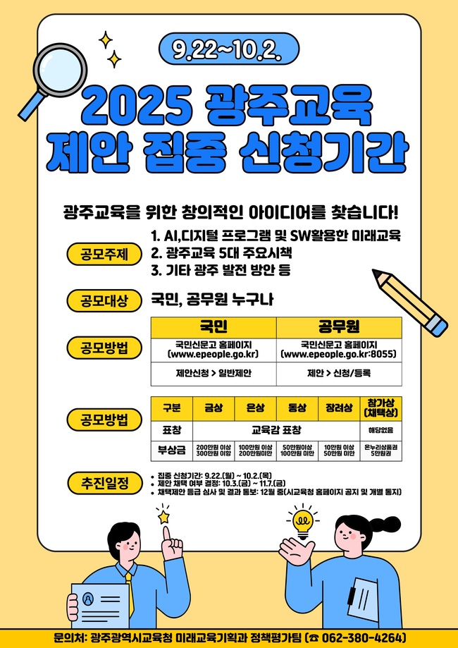 공모 부문은 ▲AI‧디지털 프로그램 및 소프트웨어(SW)를 활용한 미래교육 방안 ▲다양성교육, 책임교육, 공정교육, 미래교육, 상생교육 등 광주교육 5대 시책 구현 아이디어 ▲광주교육 발전 방안 등 3개다.