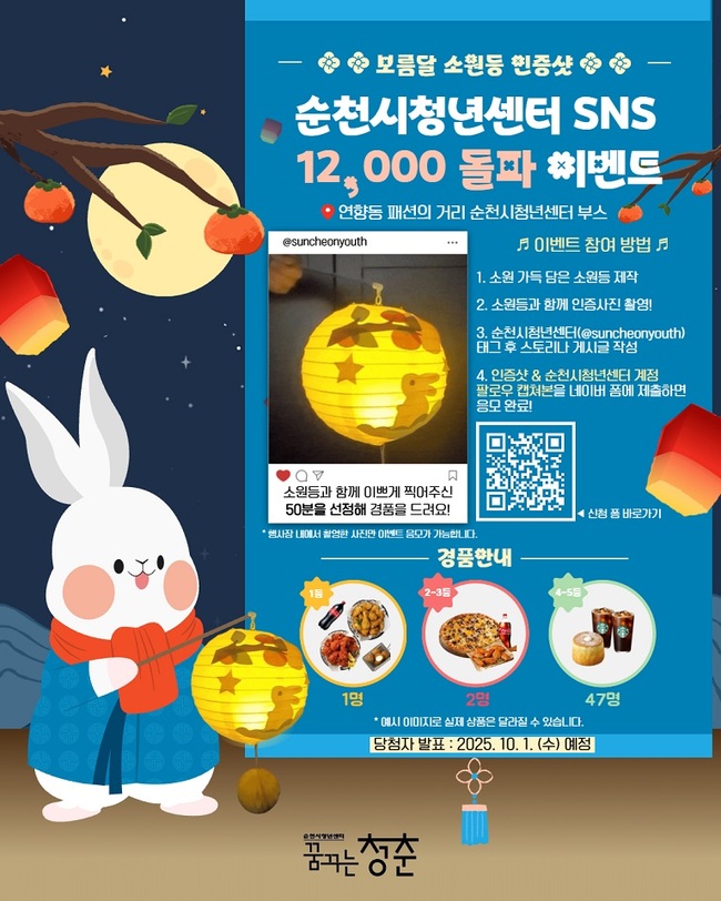 참여 대상은 18~45세 청년이며, 청년센터 인스타그램 팔로우 인증과 청년의 날 보름달 소원등 만들기 참여 인증 사진을 네이버 폼을 통해 응모하면 심사를 통해 소정의 경품을 증정할 예정이다.