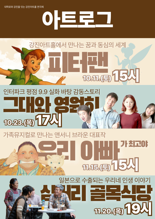 올 초 1,200여 명의 발걸음을 강진아트홀로 이끌며 시작을 알린 ‘아트로그 가을 시즌’에는 가족뮤지컬 ‘피터팬’, ‘우리 아빠가 최고야’, 연극 ‘그대와 영원히-for you’, ‘삼거리 골목식당’ 등 총 네 작품이 상연 예정이며 피터팬 396석을 포함한 약 1,100석의 사전 예약이 신청되어 흥행을 점치고 있다.