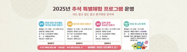 이번 추석 특별체험 프로그램은 △명태모양 도어벨&우리집 문패 만들기 △한가위 만쥬 만들기 △알록달록 꽃송편 만들기로 가족들이 함께 즐길 수 있는 다양한 활동으로 구성됐다. 희망자들은 온라인 사전 예약을 통해 참여할 수 있다.