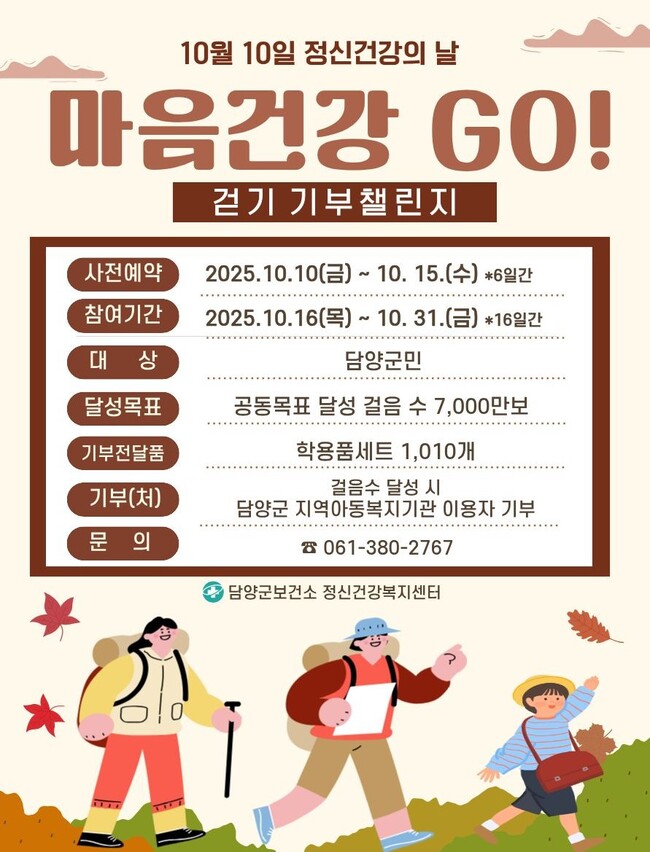 담양군은 10월 10일 ‘세계 정신건강의 날’을 맞이하여 전 군민을 대상으로 걷기 기부 챌린지를 운영한다고 밝혔다.