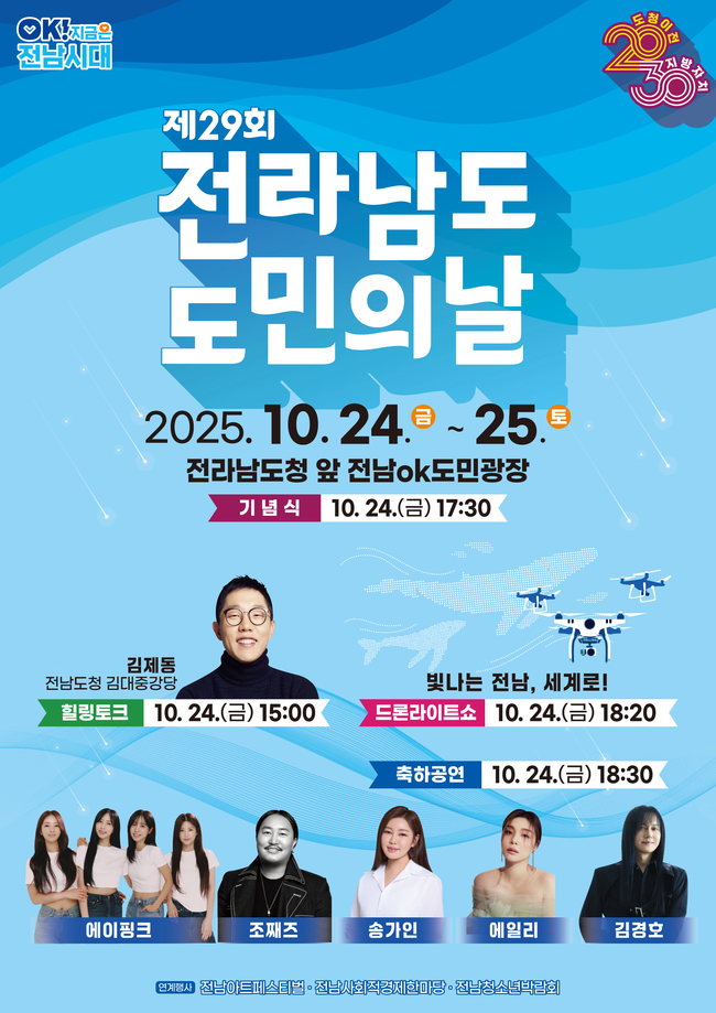 이와 함께 도청 김대중강당에서 열리는 도민 힐링 토크, 출생기본수당·햇빛바람연금 도입 등 지방자치 30주년 정책 전시, 도청 이전 20주년 기념 사진전 등 다채로운 전시·체험 프로그램도 마련돼 전남의 발전 여정과 도민 삶의 변화를 되돌아보는 뜻깊은 행사로 치러진다.
