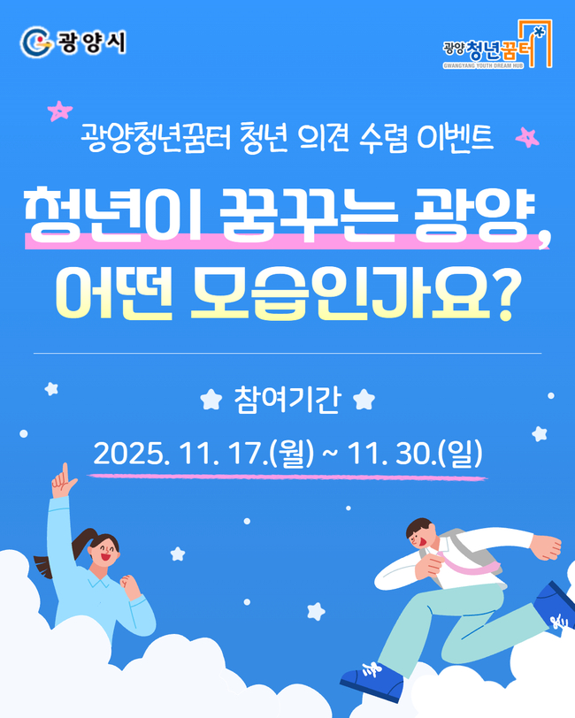 광양청년꿈터가 오는 17일부터 30일까지 ‘청년이 꿈꾸는 광양, 어떤 모습인가요?’를 주제로 청년 의견 수렴 이벤트를 진행한다고 17일 밝혔다.