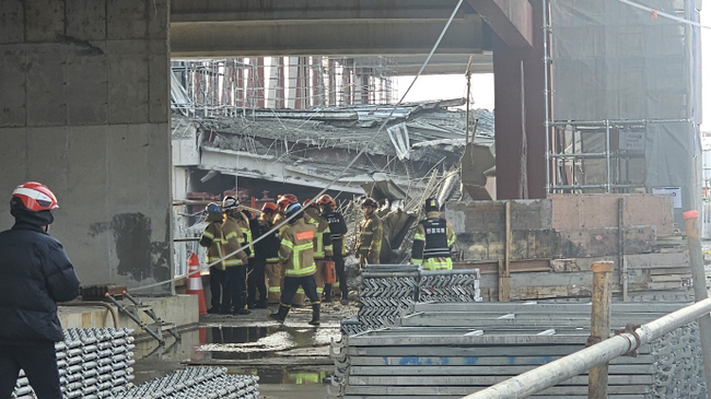 소방 당국은 이 사고로 구조물에 깔린 현장 작업자 4명에 대한 구조 작업을 벌이고 있다.