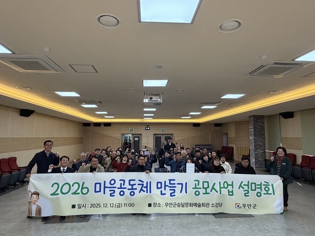 무안군은 지난 12일 승달문화예술회관 소강당에서 ‘2026년 마을공동체 만들기 공모사업 설명회’를 개최했다고 밝혔다.