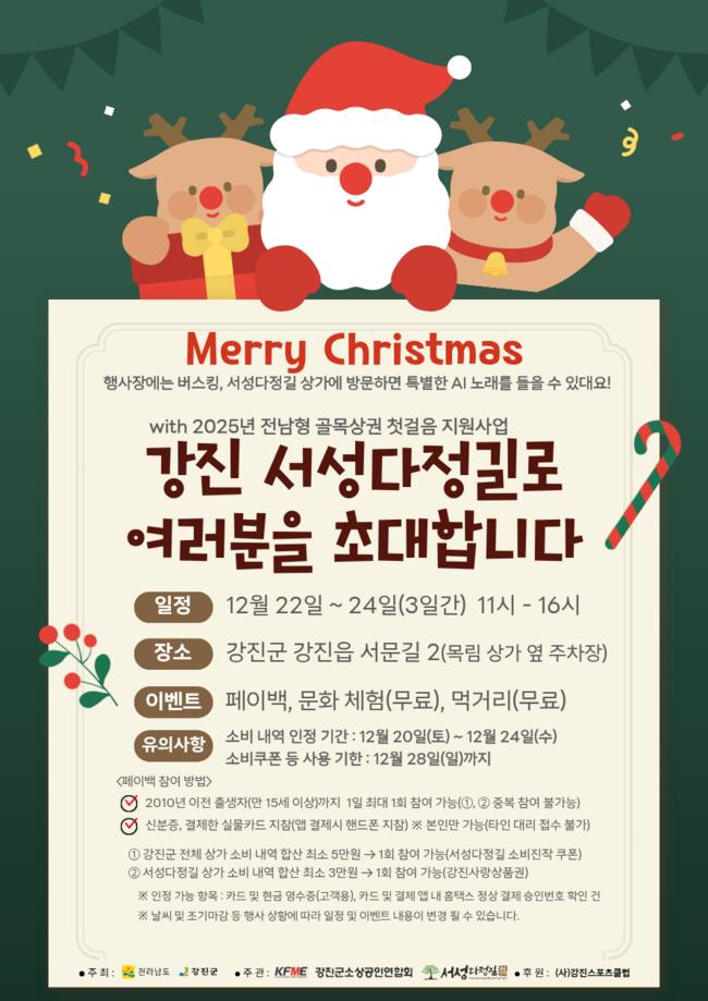 강진군이 오는 22일부터 24일까지 3일간 서성다정길 골목형상점가 구역 일대에서 연말 분위기를 가득 담은 크리스마스 특별행사를 개최한다고 16일 밝혔다.