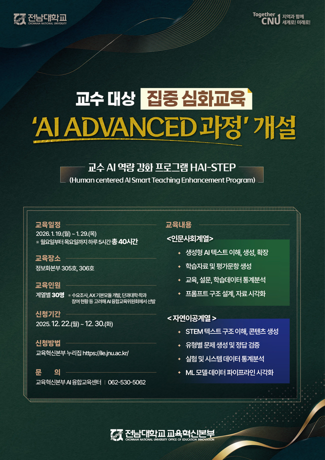 한편, 전남대학교는 2026년 3월 보건의료계열 AI ADVANCED 과정을 추가로 운영할 예정이며, 인문사회계열과 자연이공계열 과정도 방학 기간을 활용해 정기적으로 운영할 계획이다.