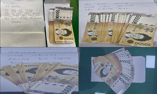 봉투에는 “저는 국동에 사는 주민입니다. 저도 넉넉한 살림은 아니지만 저보다 더 어려운 사람들이 있을 거라는 생각에 조그만한 도움이 되었으면 합니다. 오래전부터 하고 싶었는데 이제야 행동으로 옮기니 내 마음이 무척 편안합니다.”라는 내용의 손편지도 함께 담겨 있었다.