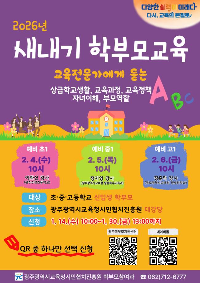 4일에는 초등 신입생 학부모를 대상으로 광주수창초등학교 이화신 교사가 ‘초등학교 1학년 길라잡이’를 주제로 강의에 나서 입학 준비 사항과 학교 적응 방법을 안내한다. 5일에는 시교육청 정지영 장학사가 중학교 교육과정과 자유학기제, 고교학점제에 대해 설명하며, 6일에는 정훈탁 장학관이 대입전형 전반과 진학 준비 전략을 소개할 예정이다.