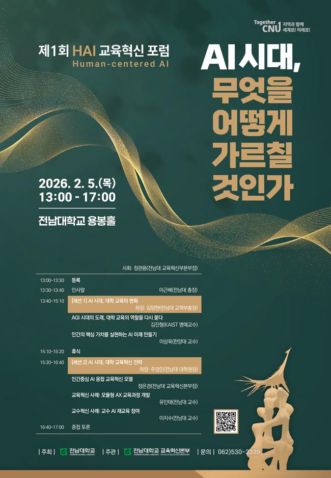 전남대학교가 다음달 5일 전남대 국제회의동 용봉홀에서 ‘제1회 HAI(Human-centered AI) 교육혁신 포럼’을 개최하고, 인공지능 시대에 대응하는 대학 교육의 새로운 이정표를 제시한다.