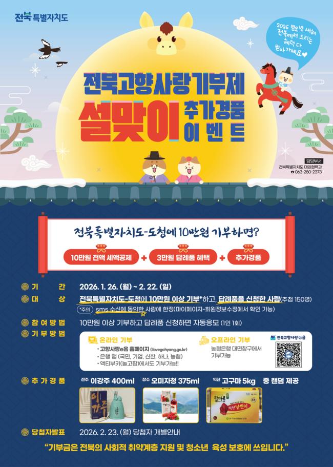도는 이번 설 이벤트 기간 기부에 참여한 사람을 대상으로 추첨을 통해 총 150명에게 전주 이강주, 장수 오미자청, 익산 고구마 등 전북을 대표하는 특산품을 추가로 증정할 예정이다. 경품은 별도의 비용 부담 없이 기부자의 자택으로 무료 배송된다.