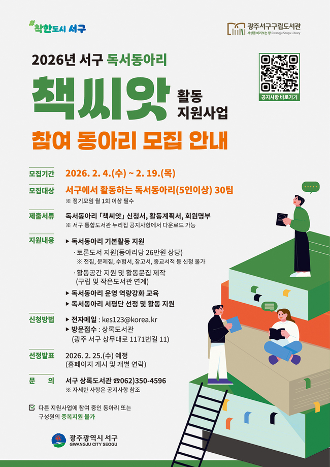 김이강 서구청장은 “주민들이 함께 읽고 함께 나누는 생활 독서가 일상에 자리 잡을 수 있도록 독서동아리 ‘책씨앗’ 사업을 지속적으로 추진하겠다”며 “올해도 많은 독서동아리가 적극 참여해 주길 바란다”고 말했다.