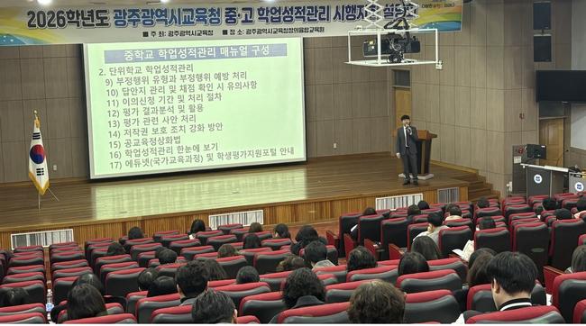 광주시교육청은 11일 광주창의융합교육원 대강당에서 중·고등학교 교감 및 교육연구부장 160여 명을 대상으로 ‘2026학년도 중·고 학업성적관리 시행지침 설명회’를 개최했다.