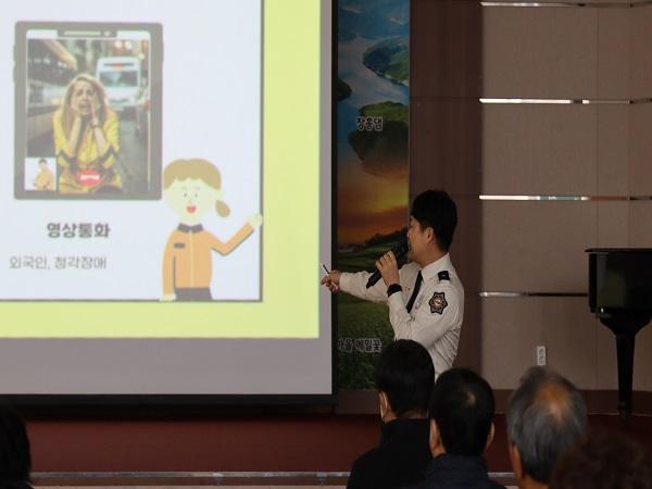 교육 내용은 ▲119 신고 요령과 올바른 위치 알리기 ▲근무 중에 발생할 수 있는 주요 질환(심장병, 뇌졸중, 저혈당, 경련, 온열질환)대처 방법 ▲119구급대 도착 전까지 할 수 있는 간단한 응급처치 등으로 구성되어, 어르신들의 눈높이에 맞춘 설명과 실제 사례 중심으로 이뤄졌다.